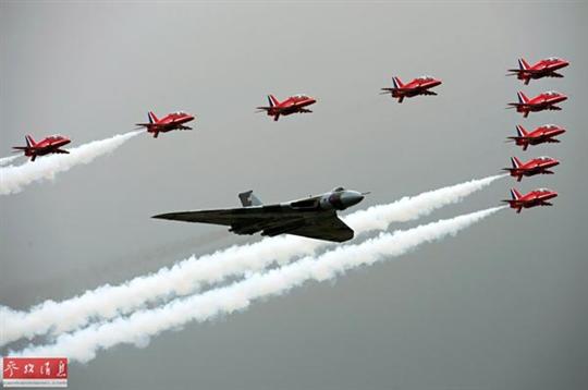 7月9日,在英國南部小城范堡羅,英國紅箭飛行隊和一架火神轟炸機在范堡羅航展上進(jìn)行開(kāi)幕表演。來(lái)源:參考消息