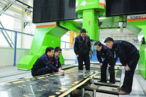 中航工業(yè)西飛引進(jìn)的數控激光刻型機及柔性?shī)A具系統,自去年6月份完成安裝調試工作后,目前已經(jīng)成功應用于生產(chǎn)中,特別是在新機研制中發(fā)揮了重要作用。該設備交付應用至今,完成零件刻型涉及5個(gè)機型、15個(gè)項目,零件數量500多件,交付合格率100%。該設備的應用,將逐步取代原始的化銑樣板,降低勞動(dòng)強度,提高生產(chǎn)效率和化銑質(zhì)量。圖為使用單位負責人與技術(shù)人員、操作工人在現場(chǎng)對比查看零件刻型情況。
