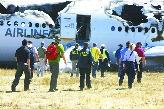 美國國家運輸安全委員會(huì )調查人員在事故現場(chǎng)檢查飛機殘骸。