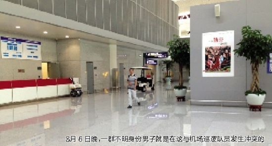 8月6日晚10點(diǎn)半左右,又有一幫不明身份男子,沖進(jìn)新橋機場(chǎng)航站樓,“在里面肆意抽煙、拉客”,態(tài)度囂張,人數有一二十人之眾。這次遭遇機場(chǎng)治安巡邏隊員勸阻時(shí),對方竟直接動(dòng)手,毆打巡邏隊員,致使多人受傷。
