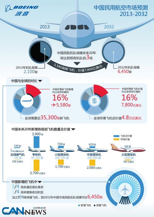 中國市場(chǎng)領(lǐng)先的飛機制造商波音公司預測,未來(lái)20年,中國將需要5580架新飛機,總價(jià)值達7800億美元。波音今天在北京發(fā)布了2013年中國市場(chǎng)展望,預測到2032年中國民航機隊的規模將達到現有機隊的三倍。