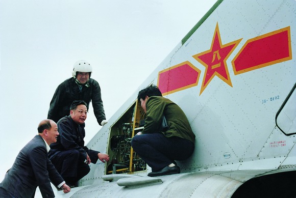 殲-8飛機0102號機試飛中,顧誦芬與飛行員和技術(shù)人員一起研究排除故障!