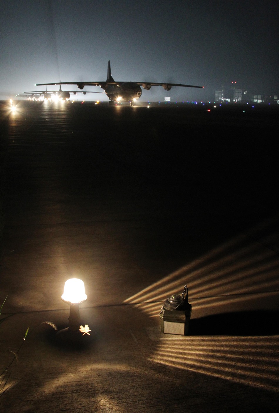 大機群戰機整裝列陣,執行夜間投送任務(wù)訓練。