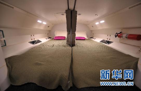 這是飛機內的機組人員休息室(12月9日攝)。 12月9日,波音787“夢(mèng)想”飛機飛抵?诿捞m國際機場(chǎng),開(kāi)始為期2天的全球巡展?谡净顒(dòng)。此前波音公司于12月4日在北京啟動(dòng)了787飛機全球巡展“夢(mèng)想之旅”,之后將于11日飛赴非洲。波音787可搭載乘客210至250名,航程達14200至15200千米,飛行速度0.85馬赫。 新華社記者 郭程攝