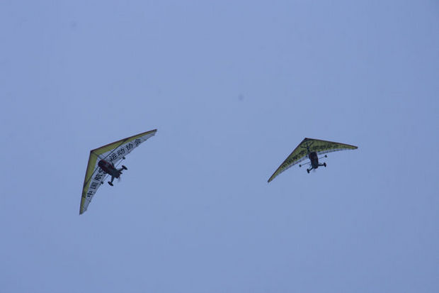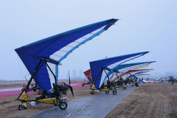 在?谑腥f(wàn)綠園后觀(guān)海臺賽點(diǎn),動(dòng)力懸掛滑翔機整裝待發(fā)