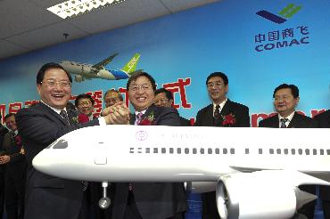 2月14日,中國商飛公司董事長(cháng)金壯龍(前左)與中銀航空租賃董事長(cháng)陳四清(前右)在新加坡出席C919客機啟動(dòng)用戶(hù)協(xié)議。
