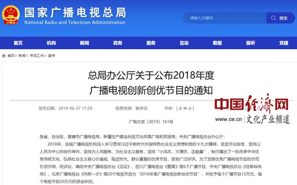 2018年,全國廣播電視機構深入學(xué)習貫徹習近平新時(shí)代中國特色社會(huì )主義思想和黨的十九大精神,堅定文化自信,堅持以人民為中心的創(chuàng )作導向,堅持為人民服務(wù)、為社會(huì )主義服務(wù),堅持“小成本、大情懷、正能量”,制作播出了一批傳承中華優(yōu)秀傳統文化、弘揚社會(huì )主義核心價(jià)值觀(guān)、貼近時(shí)代、群眾喜愛(ài)的優(yōu)秀節目,受到廣泛好評。為了發(fā)揮優(yōu)秀廣播電視節目的示范引領(lǐng)作用,經(jīng)評議,確定中央廣播電視總臺《見(jiàn)證》、四川廣播電視臺《撤離》等6個(gè)廣播節目,中央廣播電視總臺《經(jīng)典詠流傳》、北京廣播電視臺《向前一步》等20個(gè)電視節目為“2018年度廣播電視創(chuàng )新創(chuàng )優(yōu)節目”,并給予每個(gè)廣播節目15萬(wàn)元、每個(gè)電視節目20萬(wàn)元的資金扶持。