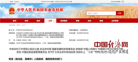 經(jīng)濟日報-中國經(jīng)濟網(wǎng)北京7月14日訊 近日,中央農辦、農業(yè)農村部、發(fā)展改革委、財政部、人民銀行、銀保監會(huì )、證監會(huì )等7部門(mén)聯(lián)合印發(fā)《關(guān)于擴大農業(yè)農村有效投資 加快補上“三農”領(lǐng)域突出短板的意見(jiàn)》(以下簡(jiǎn)稱(chēng)《意見(jiàn)》),部署擴大農業(yè)農村有效投資,為打贏(yíng)脫貧攻堅戰和全面建成小康社會(huì )提供堅實(shí)支撐。