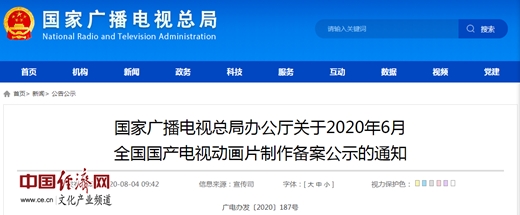 經(jīng)濟日報-中國經(jīng)濟網(wǎng)北京8月5日訊 中國經(jīng)濟網(wǎng)文化產(chǎn)業(yè)頻道記者從國家廣播電視總局官網(wǎng)獲悉,《國家廣播電視總局辦公廳關(guān)于2020年6月全國國產(chǎn)電視動(dòng)畫(huà)片制作備案公示的通知》(簡(jiǎn)稱(chēng)《通知》)于4日發(fā)布?!锻ㄖ访鞔_,2020年6月,經(jīng)備案公示的全國國產(chǎn)電視動(dòng)畫(huà)片為53部,19934分鐘。