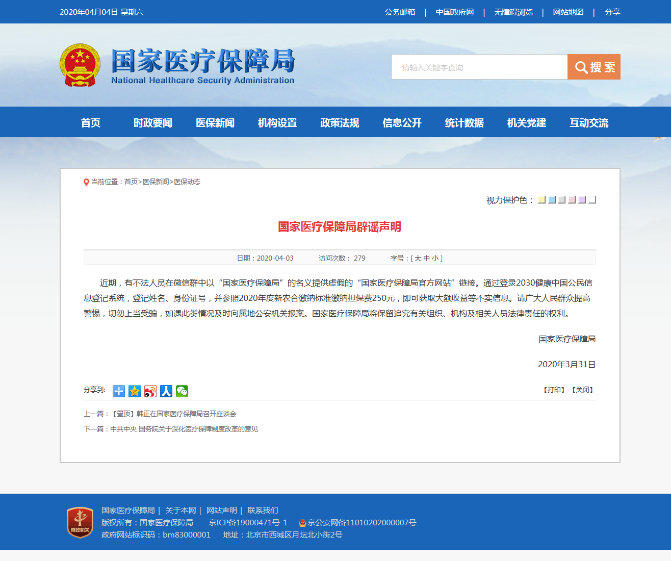 43日,國家醫療保障局發(fā)布辟謠聲明:請廣大人民群眾提高警惕,切勿上當受騙,如遇此類(lèi)情況及時(shí)向屬地公安機關(guān)報案。國家醫療保障局將保留追究有關(guān)組織、機構及相關(guān)人員法律責任的權利。