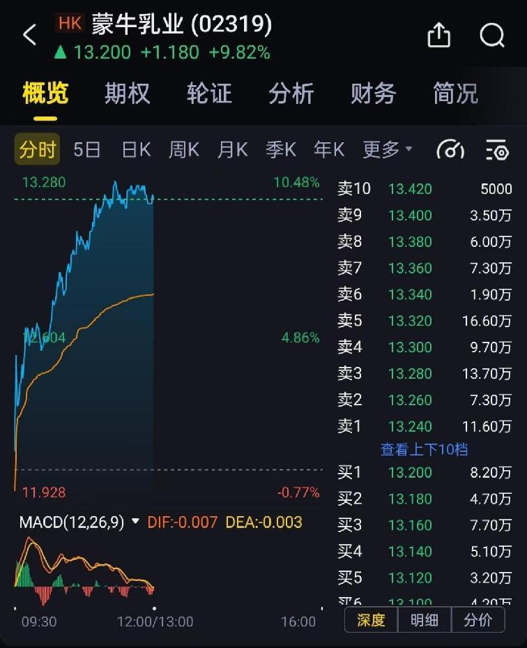 早盤(pán),蒙牛以11.92元小幅低開(kāi)后一路高漲,截至中午收盤(pán),蒙牛乳業(yè)報13.20元,上漲9.82%,成交4.64億元,成交量相較前一交易日顯著(zhù)放大。