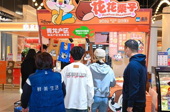 在哈一口氣便能凝結出霧的寒冬,暖呼呼的糖炒栗子最能溫暖人心。在午后的盒馬線(xiàn)下門(mén)店,糖炒栗子的檔口已經(jīng)排起了長(cháng)隊,工作人員將剛炒制出來(lái)的新鮮栗子裝進(jìn)了印有迪士尼人物奇奇蒂蒂形象的紙盒里,遞給消費者?!疤鹛鹋磁吹睦踝?,最適合當冬天小零食”、“沖著(zhù)這個(gè)包裝來(lái)買(mǎi)的,太可愛(ài)了?!?/p>