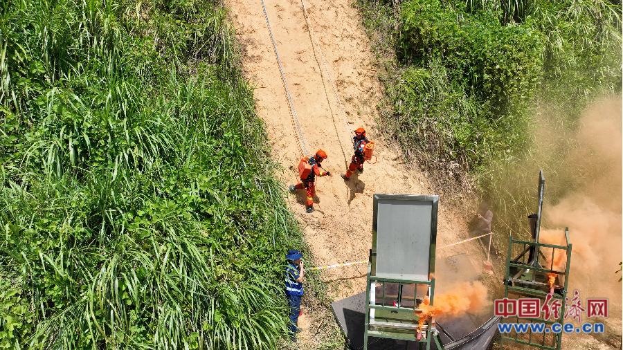 消防員在特殊地形處置煙點(diǎn)。特殊地形煙點(diǎn)處置是指在無(wú)法直接接近的陡坡設置模擬煙點(diǎn)(水袋),要求人員協(xié)同利用繩索技術(shù)安全抵近煙點(diǎn)進(jìn)行處置,以輸水時(shí)間和組織的安全性綜合評定成績(jì),檢驗特殊地形條件下滅火、救援技術(shù)結合運用的能力。 李為展/攝
