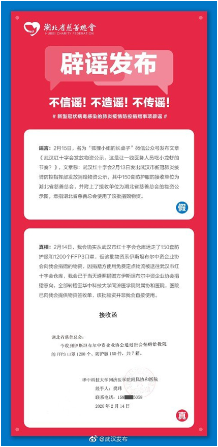 為此,湖北省慈善總會(huì )回應: “2月14日,我會(huì )確實(shí)從武漢市紅十字會(huì )倉庫運走了150套防護服和1200個(gè)FFP3口罩,但該批物資系伊斯坦布爾中資企業(yè)協(xié)會(huì )向我會(huì )捐贈的物資,因捐贈方使用免費定點(diǎn)物流被送往武漢市紅十字會(huì )倉庫;我會(huì )已于當天遵照捐贈方伊斯坦布爾中資企業(yè)協(xié)會(huì )捐贈意向,全部轉贈至華中科技大學(xué)同濟醫學(xué)院附屬協(xié)和醫院,醫院已向我會(huì )提供物資簽收單,該批物資并非我會(huì )直接使用?!?/p>