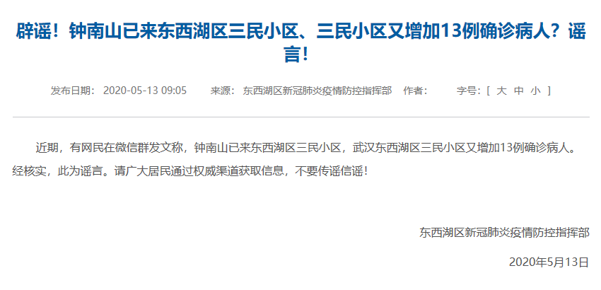 據武漢市東西湖區人民政府官網(wǎng)5月13日消息,經(jīng)核實(shí),網(wǎng)傳“鐘南山已來(lái)東西湖區三民小區,武漢東西湖區三民小區又增加13例確診病人?!?“長(cháng)青街三民小區居民健康碼全部轉紅碼、三民小區門(mén)口全是特警守門(mén)”均系謠言。