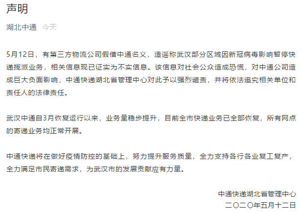 5月12日,湖北中通吉物流有限公司官微“湖北中通”發(fā)布聲明稱(chēng),5月12日,有第三方物流公司假借中通名義,造謠稱(chēng)武漢部分區域因新冠病毒影響暫??爝f攬派業(yè)務(wù),相關(guān)信息現已證實(shí)為不實(shí)信息。武漢中通自3月恢復運行以來(lái),業(yè)務(wù)量穩步提升,目前全市快遞業(yè)務(wù)已全部恢復,所有網(wǎng)點(diǎn)的寄遞業(yè)務(wù)均正常開(kāi)展。