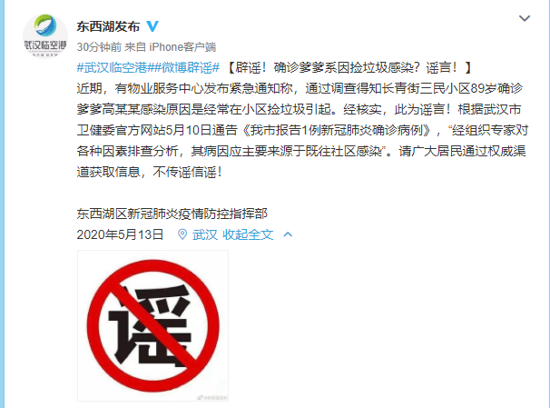 據武漢市東西湖區人民政府官方微博5月13日消息,近期,有物業(yè)服務(wù)中心發(fā)布緊急通知稱(chēng),通過(guò)調查得知武漢市東西湖區長(cháng)青街三民小區89歲確診爹爹高某某感染原因是經(jīng)常在小區撿垃圾引起。經(jīng)核實(shí),此為謠言。根據武漢市衛健委官方網(wǎng)站5月10日通告《我市報告1例新冠肺炎確診病例》,“經(jīng)組織專(zhuān)家對各種因素排查分析,其病因應主要來(lái)源于既往社區感染”。請廣大居民通過(guò)權威渠道獲取信息,不傳謠信謠!