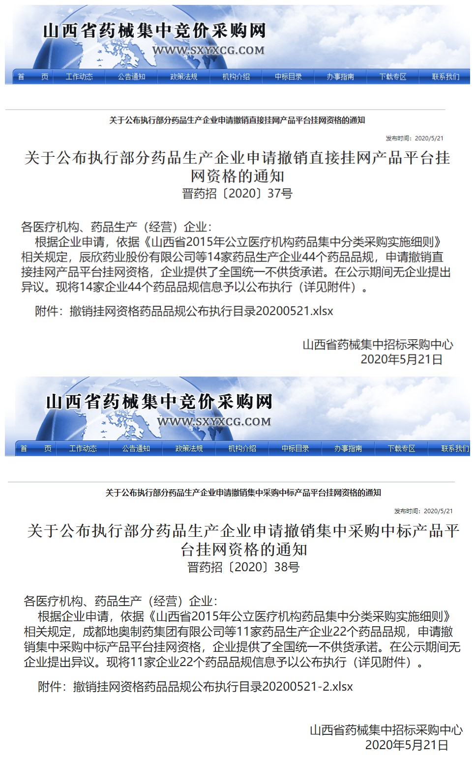 經(jīng)濟日報-中國經(jīng)濟網(wǎng)5月28日訊(記者朱國旺 郭文培)5月21日,山西省藥品集中競價(jià)采購網(wǎng)發(fā)布兩則《關(guān)于公布執行部分藥品生產(chǎn)企業(yè)申請撤銷(xiāo)集中采購中標產(chǎn)品平臺掛網(wǎng)資格的通知》。通知顯示,辰欣藥業(yè)股份有限公司等25家藥品生產(chǎn)企業(yè)66個(gè)藥品品規,申請撤銷(xiāo)集中采購中標產(chǎn)品平臺掛網(wǎng)資格,企業(yè)提供全國統一不供貨承諾。