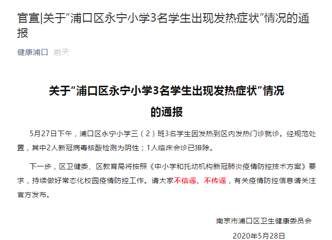 針對網(wǎng)絡(luò )傳言“南京浦口永寧小學(xué)發(fā)生聚集性疫情,導致全班停課?!?月28日, 南京市浦口區衛生健康委員會(huì )官微“健康浦口”發(fā)布《關(guān)于“浦口區永寧小學(xué)3名學(xué)生出現發(fā)熱癥狀”情況》澄清事實(shí)。