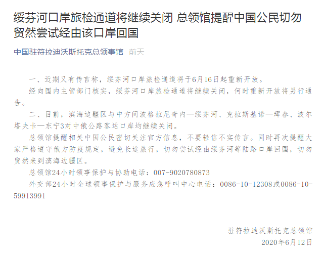 對此,6月12日,中國駐符拉迪沃斯托克總領(lǐng)事館辟謠稱(chēng),經(jīng)向國內主管部門(mén)核實(shí),綏芬河口岸旅檢通道將繼續關(guān)閉,何時(shí)重新開(kāi)放將另行通告。目前,濱海邊疆區與中方間波格拉尼奇內—綏芬河、克拉斯基諾—琿春、波爾塔夫卡—東寧3對中俄公路客運口岸均繼續關(guān)閉。