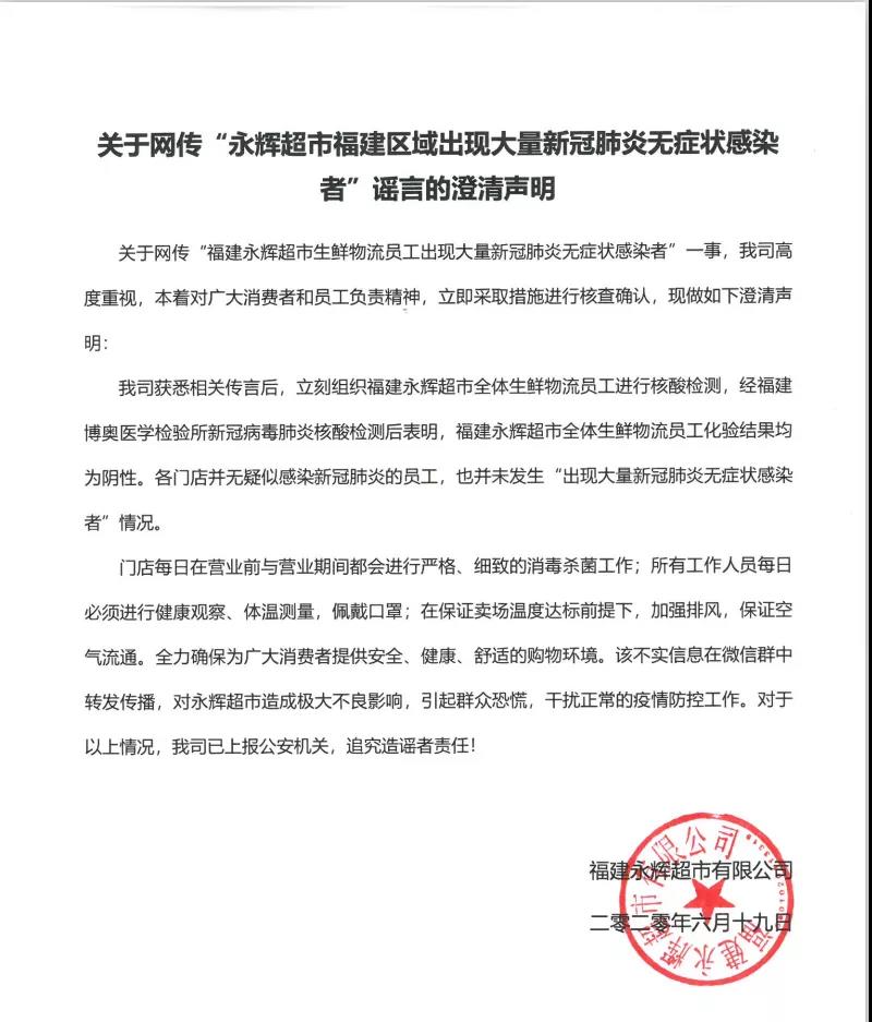 經(jīng)濟日報-中國經(jīng)濟網(wǎng)6月23日訊(記者朱國旺 郭文培) 6月19日,就“福建永輝超市生鮮物流員工出現大量新冠肺炎無(wú)癥狀感染者”一事,福建永輝超市有限公司聲明稱(chēng),獲悉相關(guān)傳言后,立刻組織福建永輝超市全體生鮮物流員工進(jìn)行核酸檢測,福建永輝超市全體生鮮物流員工化驗結果均為陰性。各門(mén)店并無(wú)疑似感染新冠肺炎的員工,也并未發(fā)生“出現大量新冠肺炎無(wú)癥狀感染者”情況。