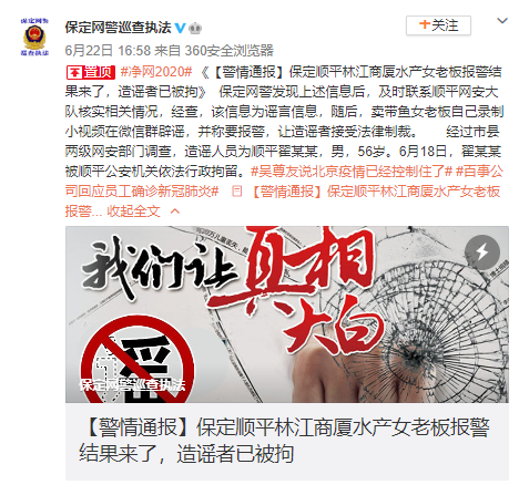 6月22日,保定市公安局網(wǎng)絡(luò )安全保衛支隊發(fā)布警情通報稱(chēng),網(wǎng)傳“河北省保定市順平縣一帶魚(yú)老板店去北京新發(fā)地進(jìn)魚(yú)被隔離”等信息為謠言。經(jīng)過(guò)市縣兩級網(wǎng)安部門(mén)調查,造謠人翟某某已被順平公安機關(guān)依法行政拘留。