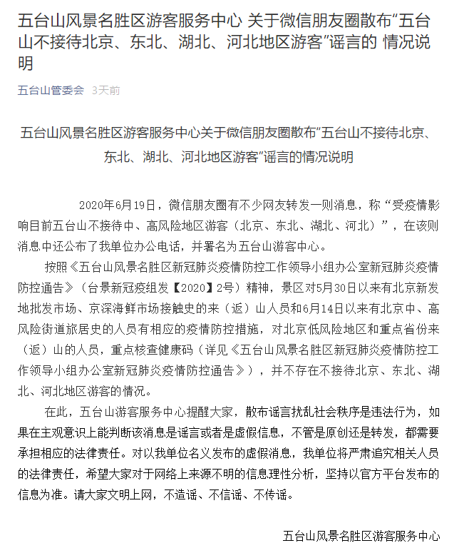 6月20日,五臺山風(fēng)景名勝區游客服務(wù)中心辟謠稱(chēng),“五臺山不接待北京、東北、湖北、河北地區游客”的說(shuō)法為謠言。