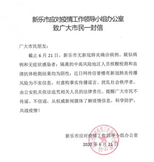 據河北省新樂(lè )市宣傳部官微21日消息,新樂(lè )市信譽(yù)樓有新冠肺炎傳播風(fēng)險為不實(shí)信息。截止6月21日,新樂(lè )市無(wú)新冠肺炎確診病例、疑似病例和無(wú)癥狀感染者;隔離的中高風(fēng)險地區人員核酸檢測和血清抗體檢測結果均為陰性。
