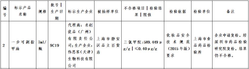 經(jīng)濟日報-中國經(jīng)濟網(wǎng)9月25日訊(記者 韓璐) 上海市藥品監督管理局23日發(fā)布的抽檢公告顯示,由名創(chuàng )優(yōu)品(廣州)有限責任公司代理的指甲油添加禁用物質(zhì)三氯甲烷,并且經(jīng)企業(yè)申請復檢后結果仍不合格。 檢驗結果顯示,該產(chǎn)品中三氯甲烷的含量高達589.449μg/g,相比《化妝品安全技術(shù)規范》(2015年版)中規定的檢測限值超標1400多倍。