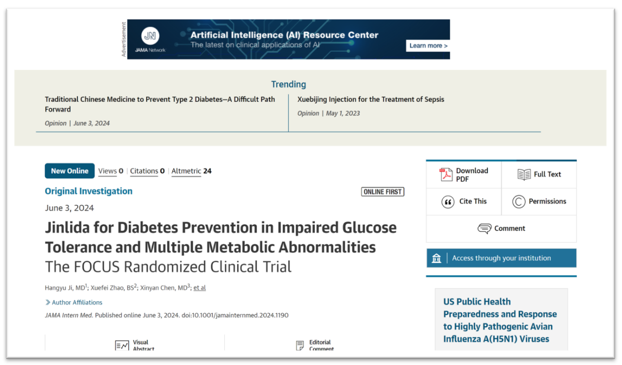 美國當地時(shí)間2024年6月3日,以嶺藥業(yè)生產(chǎn)的創(chuàng )新中藥津力達顆粒循證研究論文《津力達對糖耐量異常合并多代謝紊亂人群的糖尿病預防效果——FOCUS隨機臨床試驗》在國際權威醫學(xué)期刊《美國醫學(xué)會(huì )雜志·內科學(xué)》(JAMA Internal Medicine,影響因子39)發(fā)表。論文介紹了津力達干預代謝綜合征糖耐量異常人群取得的重大成果——津力達可降低糖耐量異常合并多代謝紊亂人群罹患糖尿病的風(fēng)險,為糖尿病的預防提供了新的視角和策略。