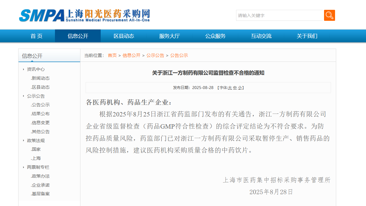 通知顯示,上海市醫藥集中招標采購事務(wù)管理所提示各醫藥機構、藥品生產(chǎn)企業(yè):根據2025825日浙江省藥監部門(mén)發(fā)布的有關(guān)通告,浙江一方制藥有限公司企業(yè)省級監督檢查(藥品GMP符合性檢查)的綜合評定結論為不符合要求。為防控藥品質(zhì)量風(fēng)險,藥監部門(mén)已對浙江一方制藥有限公司采取暫停生產(chǎn)、銷(xiāo)售藥品的風(fēng)險控制措施,建議醫藥機構采購質(zhì)量合格的中藥飲片。