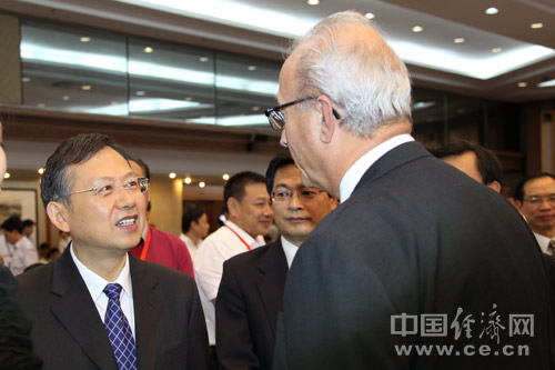 由中國道路交通安全協(xié)會(huì )、中國汽車(chē)技術(shù)研究中心和中國經(jīng)濟網(wǎng)共同主辦的“2013中國道路交通安全論壇”于8月29日在北京首都大酒店舉行。圖為公安部副部長(cháng)黃明與國際道路交通安全協(xié)會(huì )主席高斯進(jìn)行交流。中國經(jīng)濟網(wǎng) 郝紅波 攝影