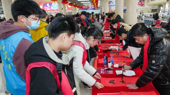 文化展示區里,傳統韻味與暖心服務(wù)交織成獨特風(fēng)景。鐵路部門(mén)、大連車(chē)站派出所、大連市慈善總會(huì )、大連青年書(shū)協(xié)的書(shū)法愛(ài)好者們揮毫潑墨,一幅幅春聯(lián)、一個(gè)個(gè)福字飽含美好祝愿,免費送到旅客手中;紅包拓印體驗更讓大家親手解鎖新春儀式感,沉浸式感受傳統年俗的魅力。大連北站的非遺展示區人氣爆棚:剪紙藝人指尖生花,一張張馬年主題剪紙惟妙惟肖;吹糖人、面塑攤位前,孩子們圍攏觀(guān)望,老師傅們巧手翻飛,將滾燙的糖漿、柔軟的面團化作形態(tài)各異的小動(dòng)物,引得陣陣歡呼;五谷畫(huà)展臺則以各色谷物為料,勾勒出寓意吉祥的新春圖景,讓旅客直觀(guān)感受傳統技藝的匠心與溫度。