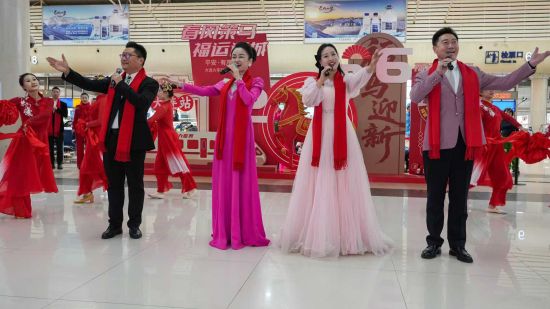 上午10時(shí)許,兩站文藝展演同步進(jìn)入高潮。由大連市總工會(huì )心連心藝術(shù)團、鐵路大連機務(wù)段、大連鐵路物流中心、大連車(chē)務(wù)段、大連供電段、金州站、大連電務(wù)段、大連客運段、大連工務(wù)段、大連車(chē)站派出所、大連北站車(chē)站派出所和大連站多家單位聯(lián)合呈現的精彩表演,在兩站輪番上演。大連站內,身著(zhù)民族服飾的表演者們演繹的《美麗中國》舞姿翩躚;獨唱《下個(gè)路口》余音裊裊,舞蹈《我愿全速奔向你》青春洋溢引得旅客頻頻點(diǎn)頭稱(chēng)贊。大連北站內,手勢舞《一路生花》溫柔治愈;古箏琵琶重奏《象王行》奏響古韻新聲;大連市文化館木偶皮影劇團帶來(lái)的復州皮影戲《鶴與龜》《三只猴子》更是吸睛無(wú)數,光影流轉間將傳統非遺的魅力傳遞給在場(chǎng)旅客。薩克斯獨奏《回家》的旋律緩緩流淌,與旅客歸鄉的心境完美契合,讓候車(chē)廳滿(mǎn)是溫情。