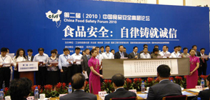 主題為“食品安全:自律鑄就誠信”的第二屆(2010)中國食品安全高層論壇今天在北京舉行。中糧聯(lián)合華潤、娃哈哈等100多家知名食品企業(yè)在論壇上共同發(fā)表誠信宣言,向社會(huì )鄭重承諾:鉻記榮辱義利,維護人民福祉。